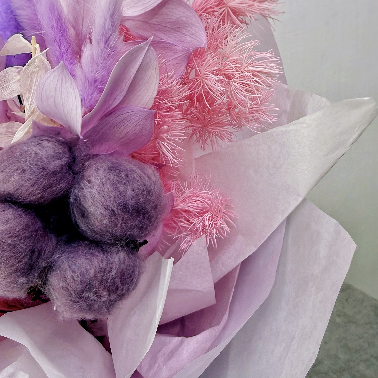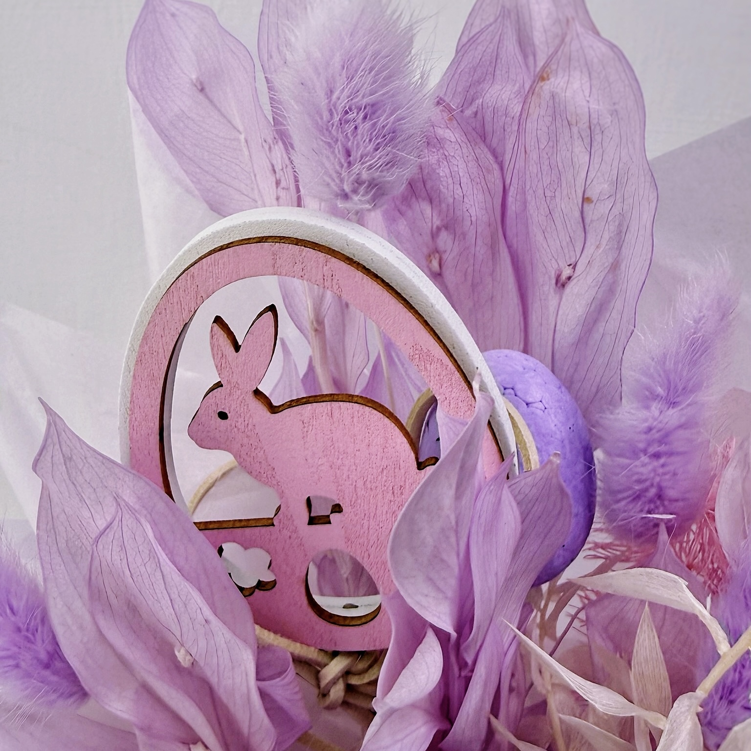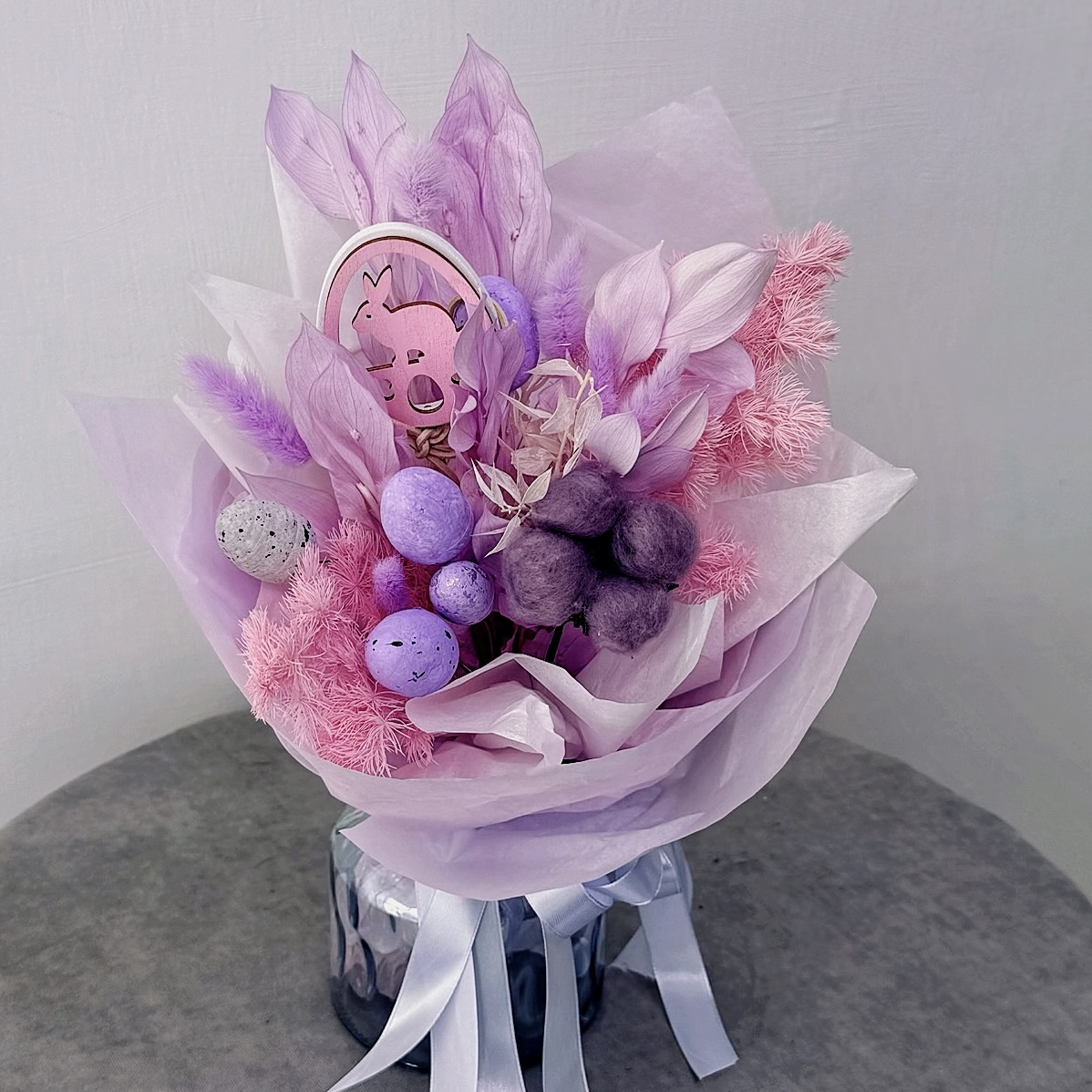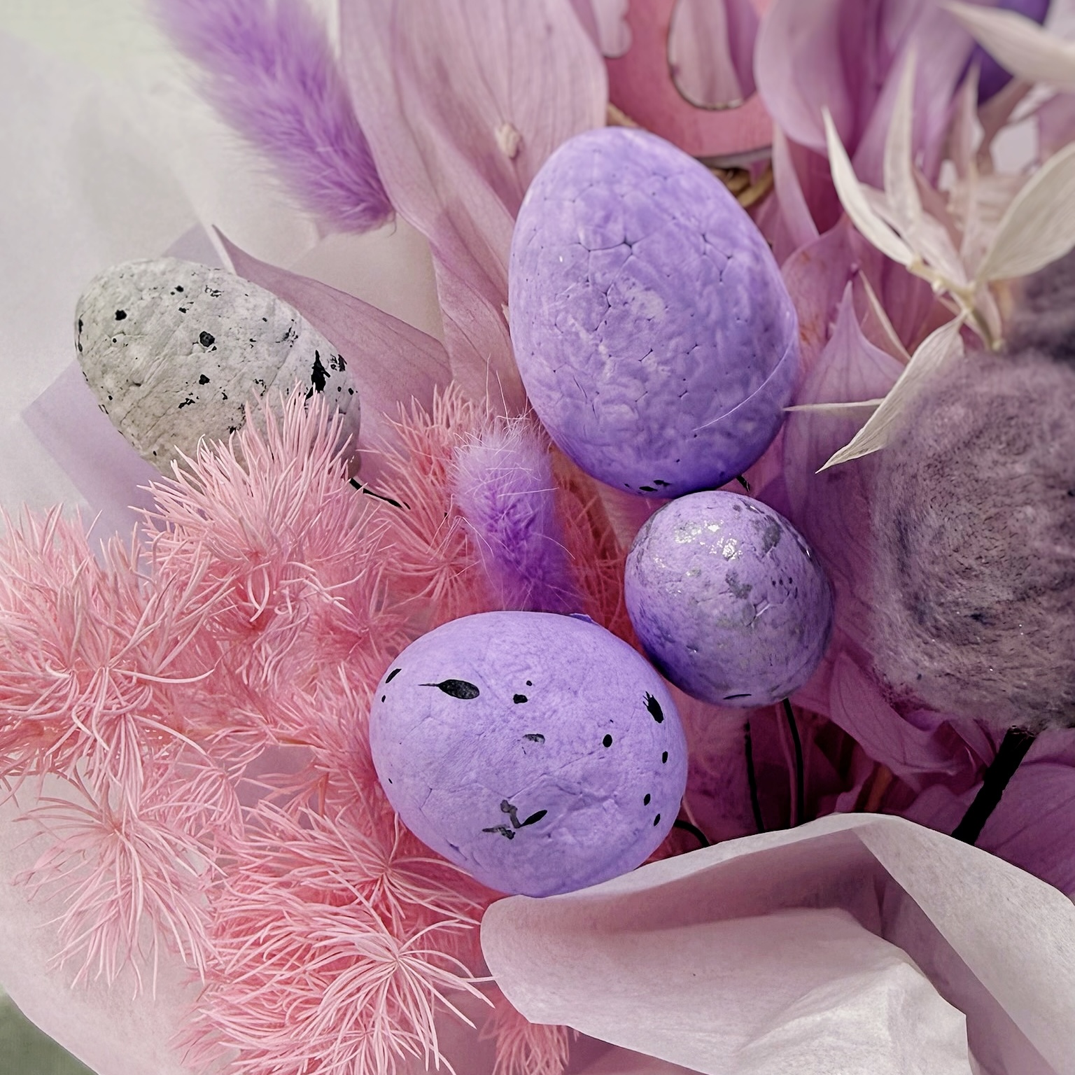 Воздушная упаковка дополняет образ, делая букет идеальным подарком для мамы, бабушки, сестры или крестницы. Хлопок символизирует домашний уют и благополучие, сухоцветы добавляют естественности и долговечности, а кролик и яйцо — главные герои Пасхи — приносят радость и ощущение чуда