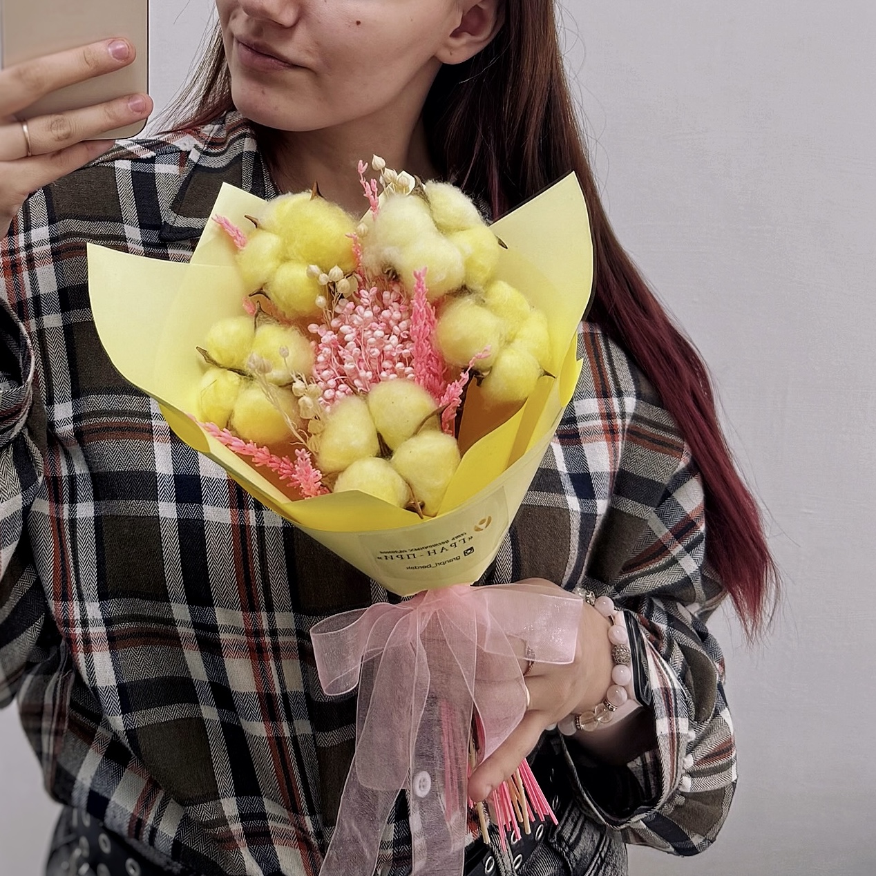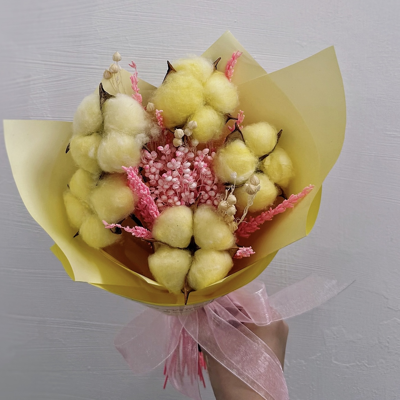 - Букет размером 20/30 см собран из стабилизированных цветов — хлопка и лаванды, которые не требуют полива и ухода, сохраняя свою естественную красоту годами. Тёплая солнечная гамма наполняет композицию энергией и светом, а нежные розовые оттенки придают ей утончённую элегантность. Хлопок символизирует уют и душевное тепло, а стабилизированная роза — вечную красоту, которая не вянет