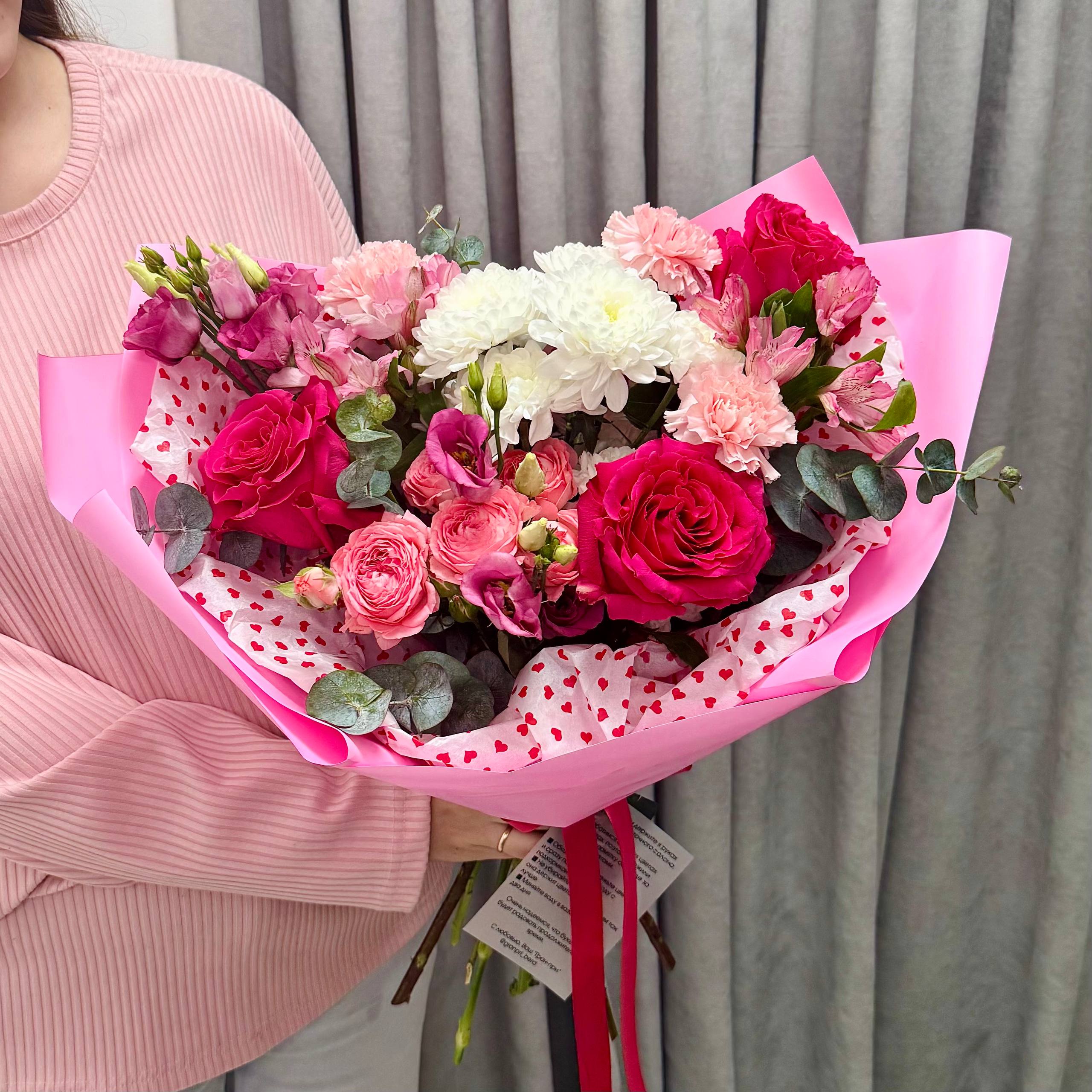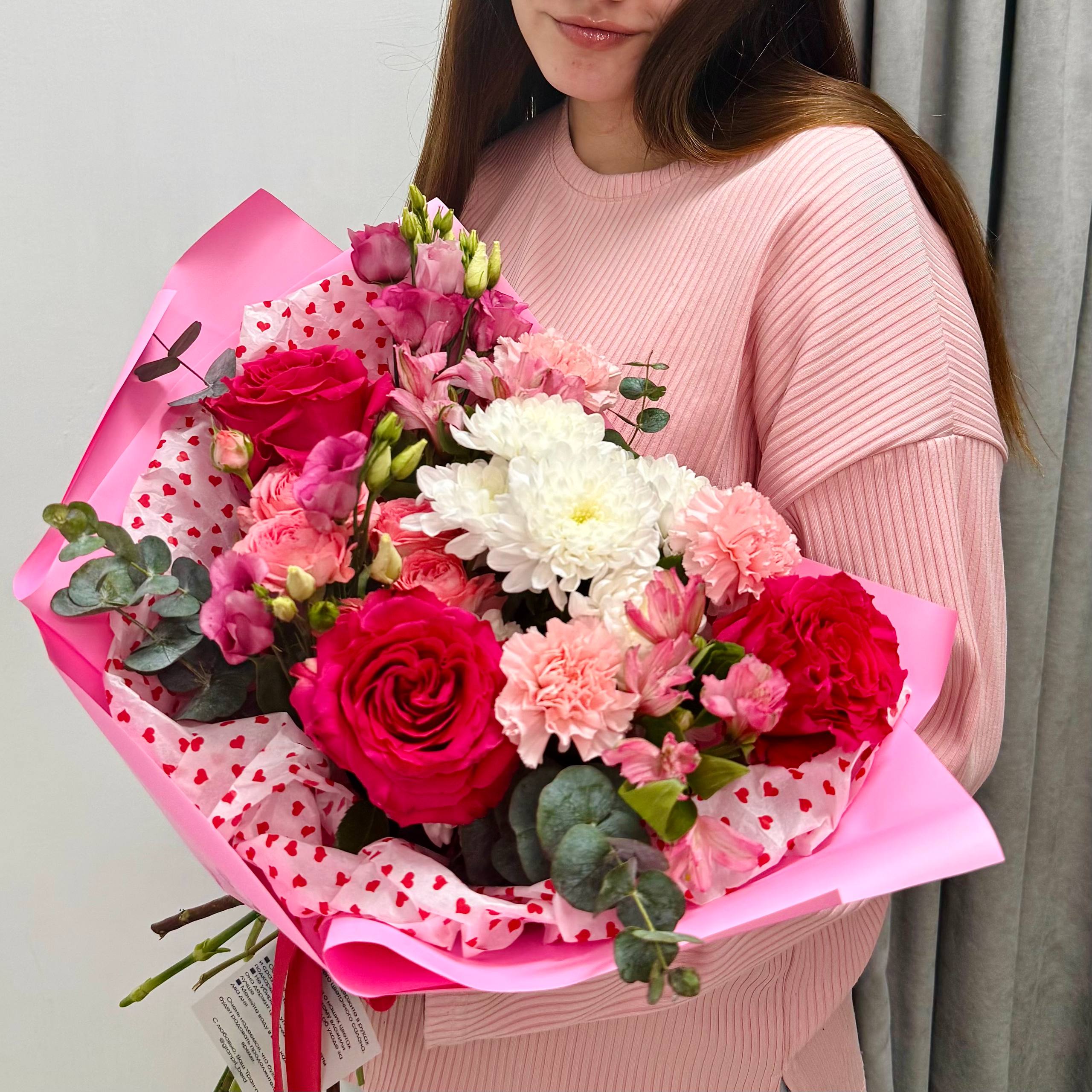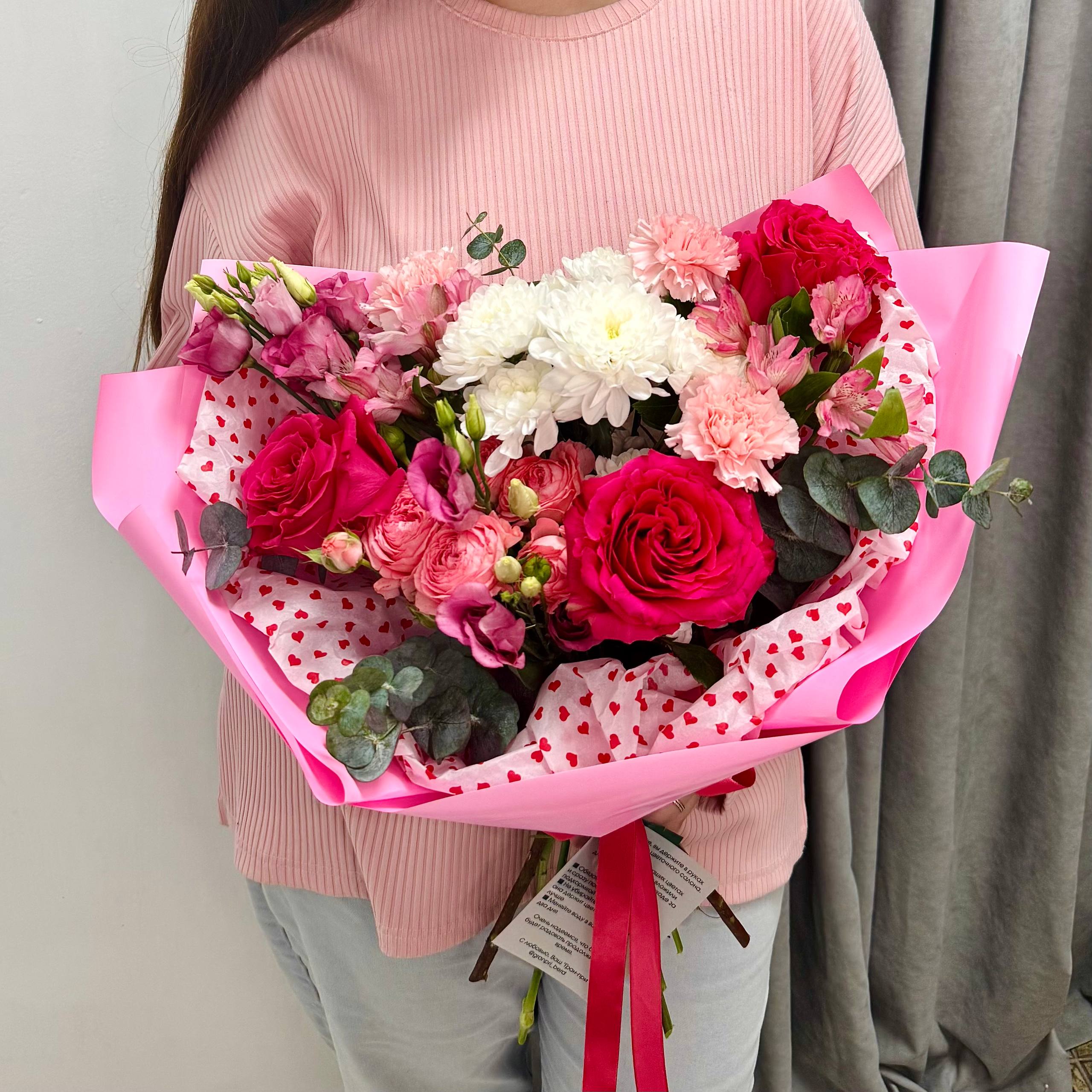 Этот впечатляющий букет размером 50/50 см создан для самых важных признаний. Малиновые розы, символ страстной любви и восхищения, гармонично дополнены нежной эустомой, трогательной альстромерией и пышными кустовыми розами. Идеальный штрих — стильная упаковка с декоративным сердцем, которая превращает букет в готовый, безупречный подарок.