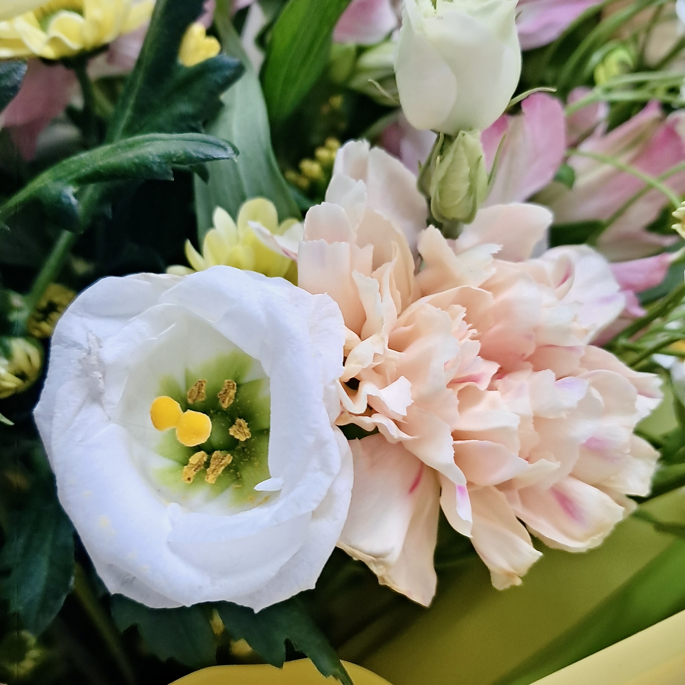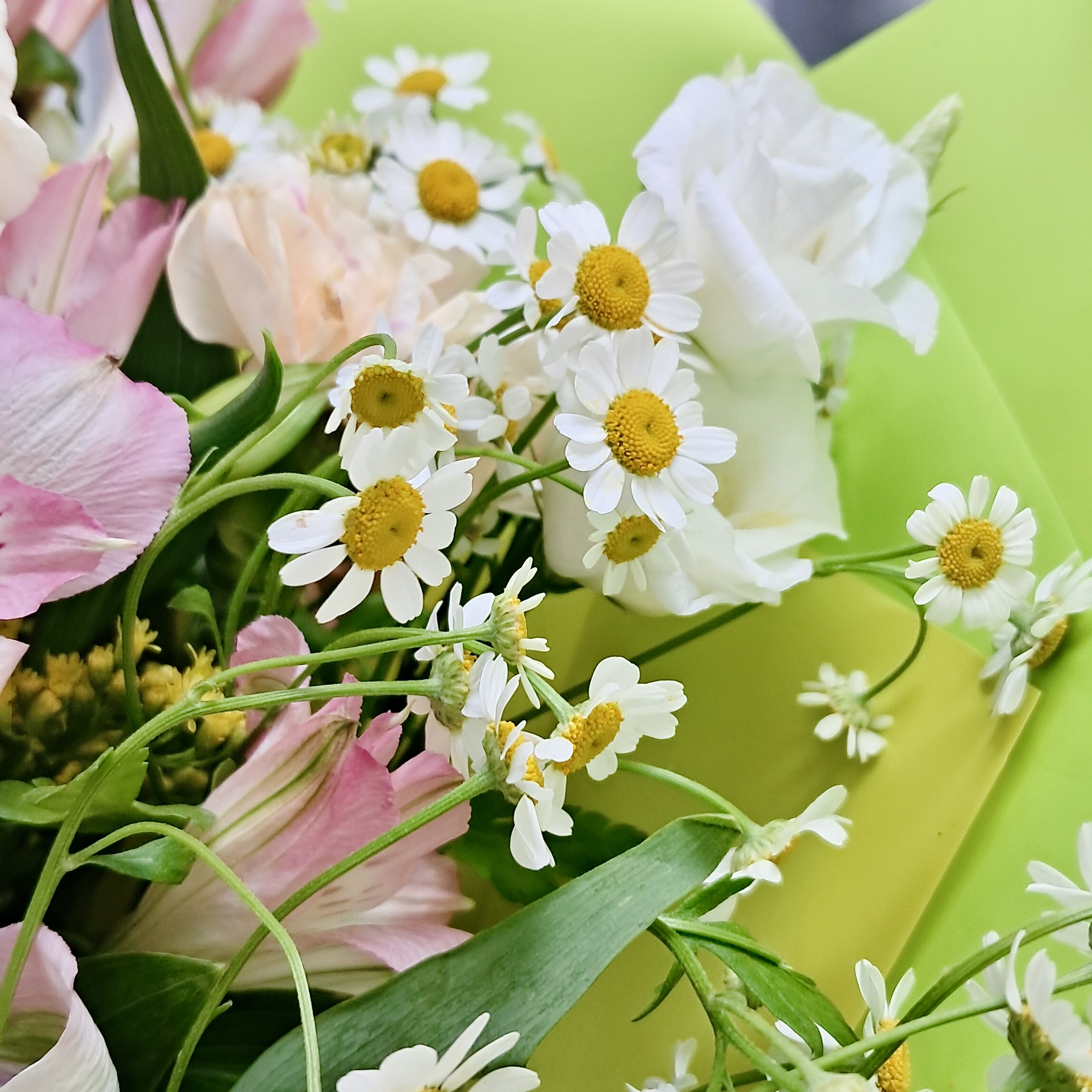 Яркие ромашки, милые хризантемы сантини, стойкие гвоздики и нежная альстромерия создают искреннюю и радостную композицию.