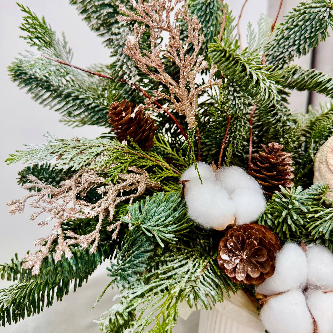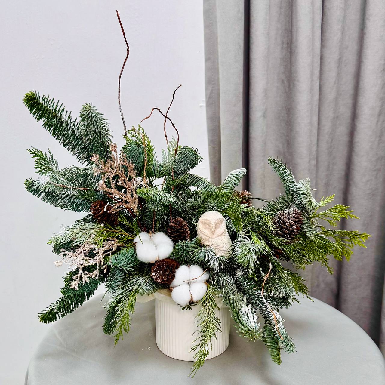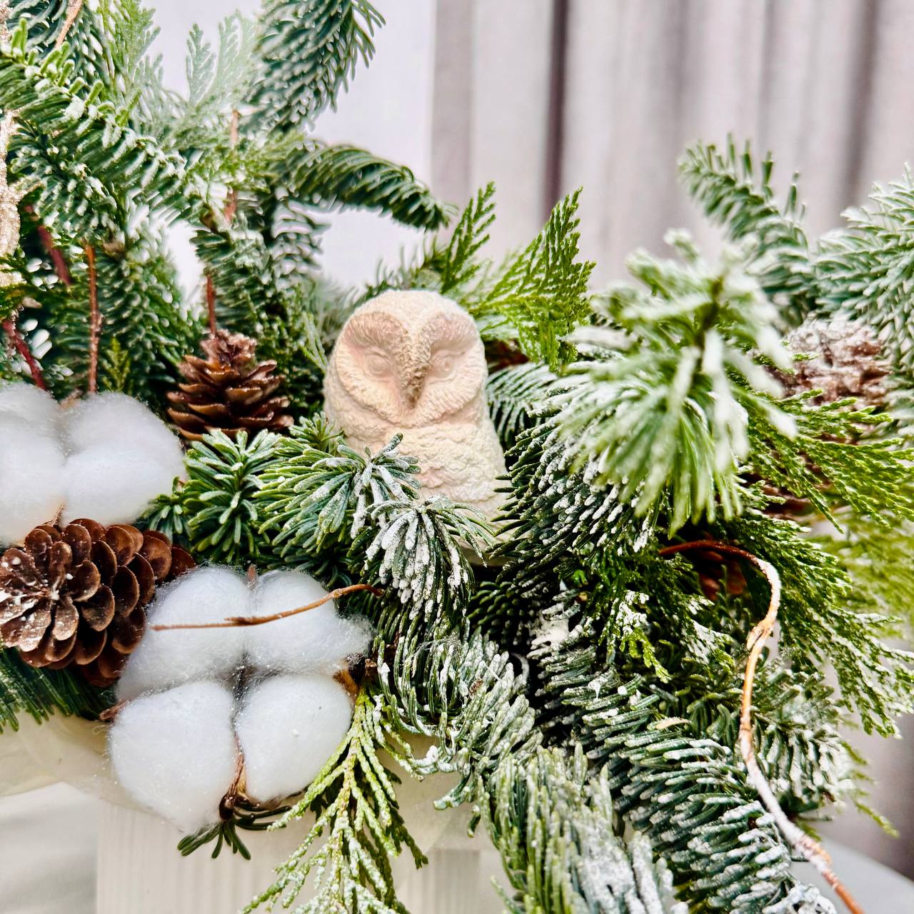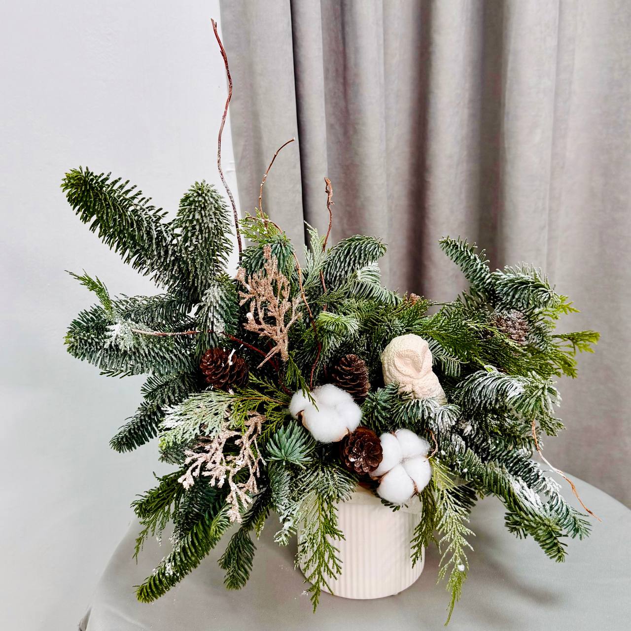Добавьте уюта и волшебства вашему празднику с зимней композицией от “Гран при”! В составе: пушистая голубая ель, натуральный хлопок, лесные шишки и стильная керамическая сова. Это оригинальное украшение создаст тёплую атмосферу и станет отличным подарком для близких.