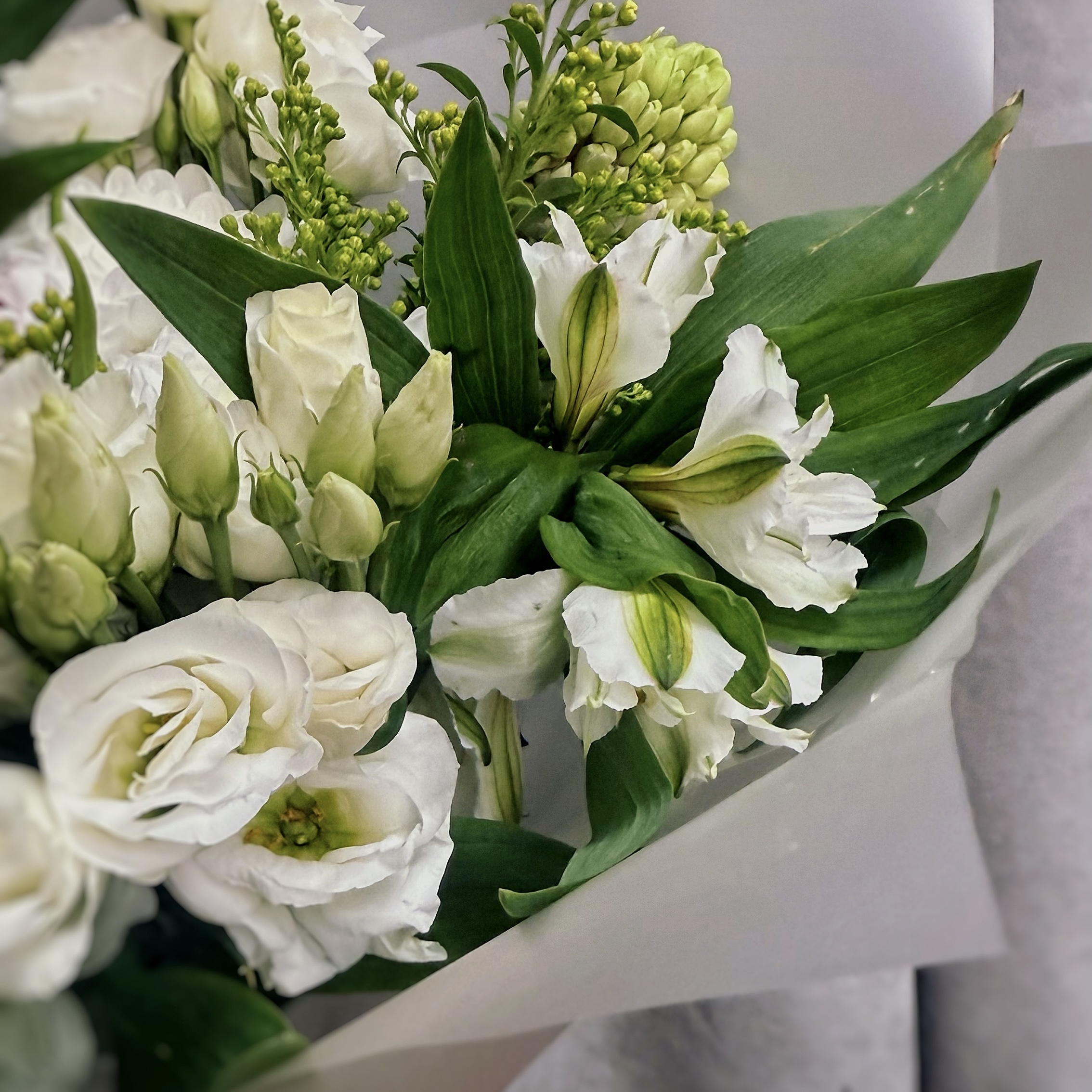 · Белая эустома — изящные цветы, напоминающие нежные розы, добавляют композиции благородство, воздушность и визуальную лёгкость