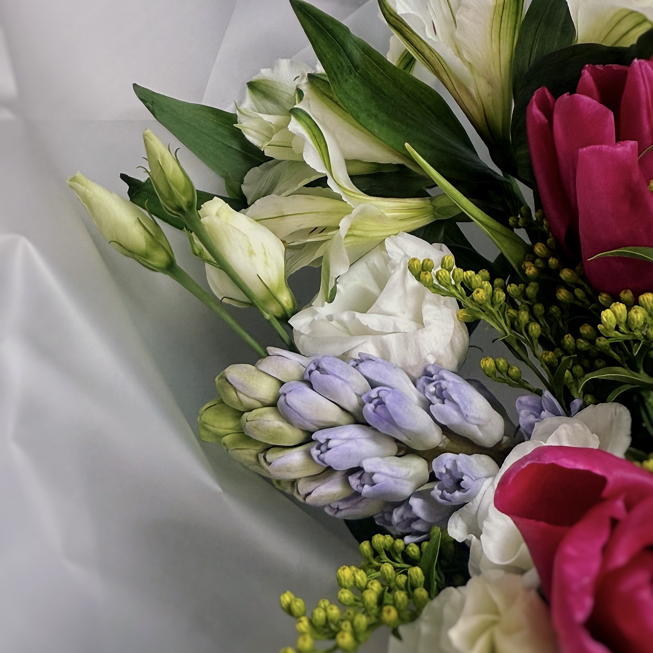 Весенний букет с тюльпанами, ароматными гиацинтами и белой эустомой в Бердске
