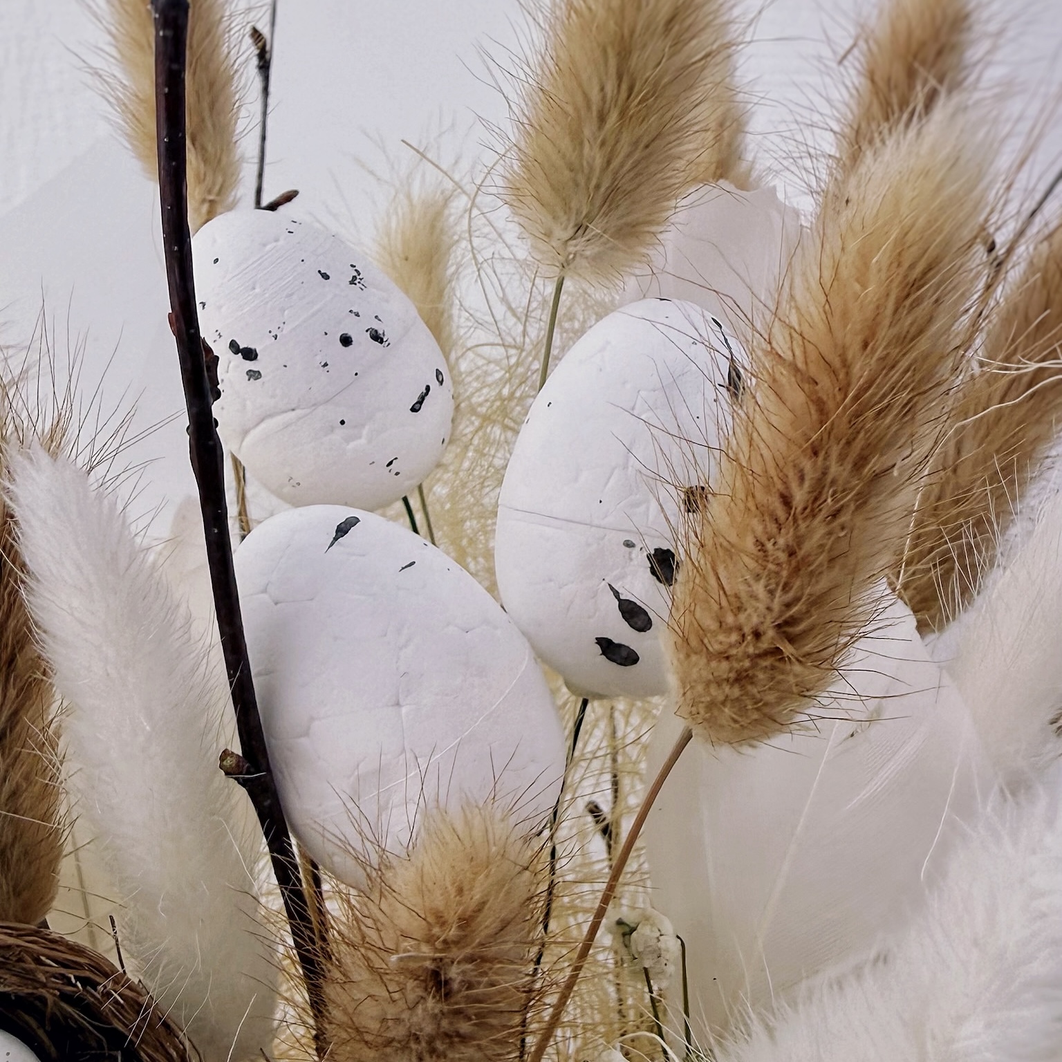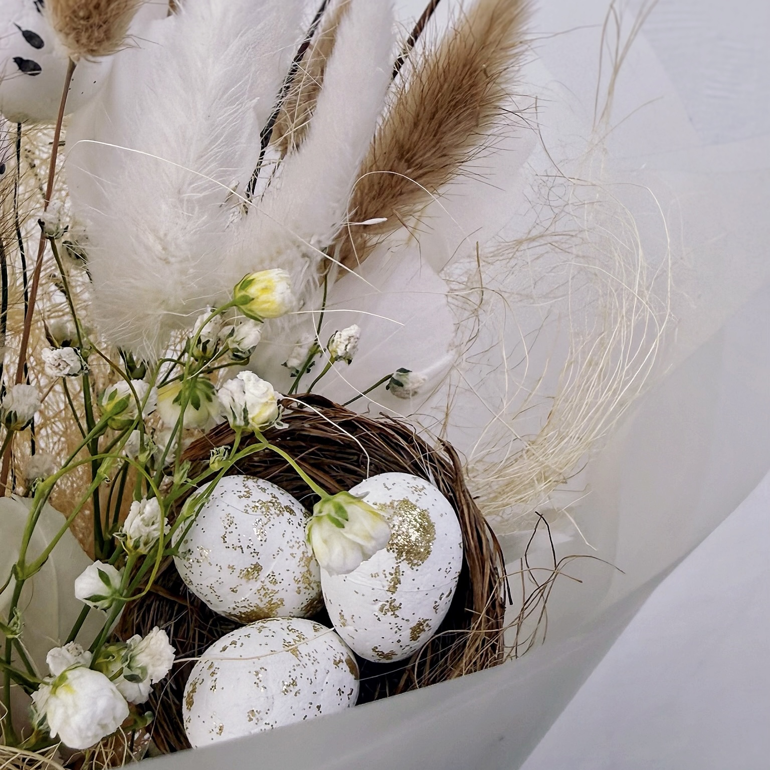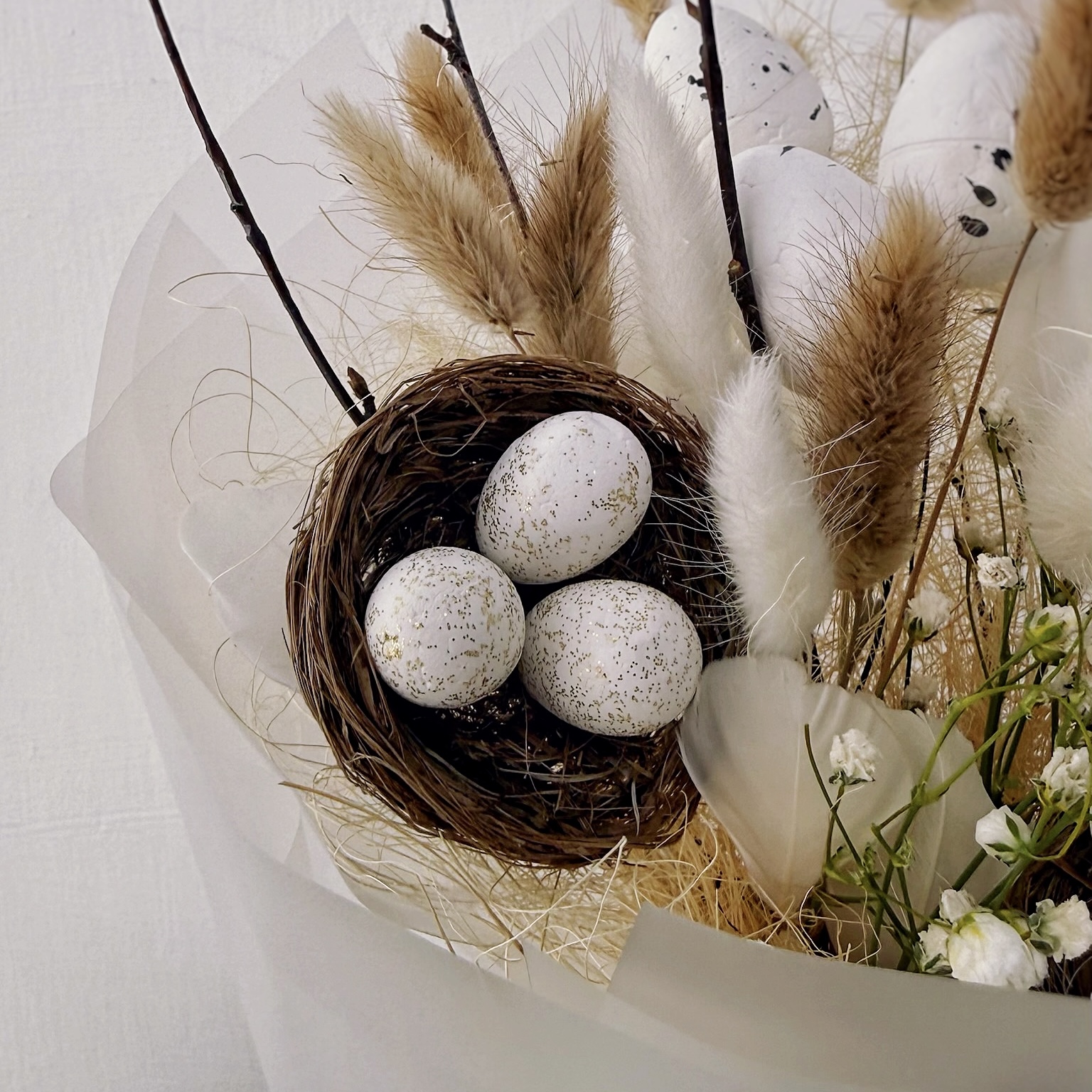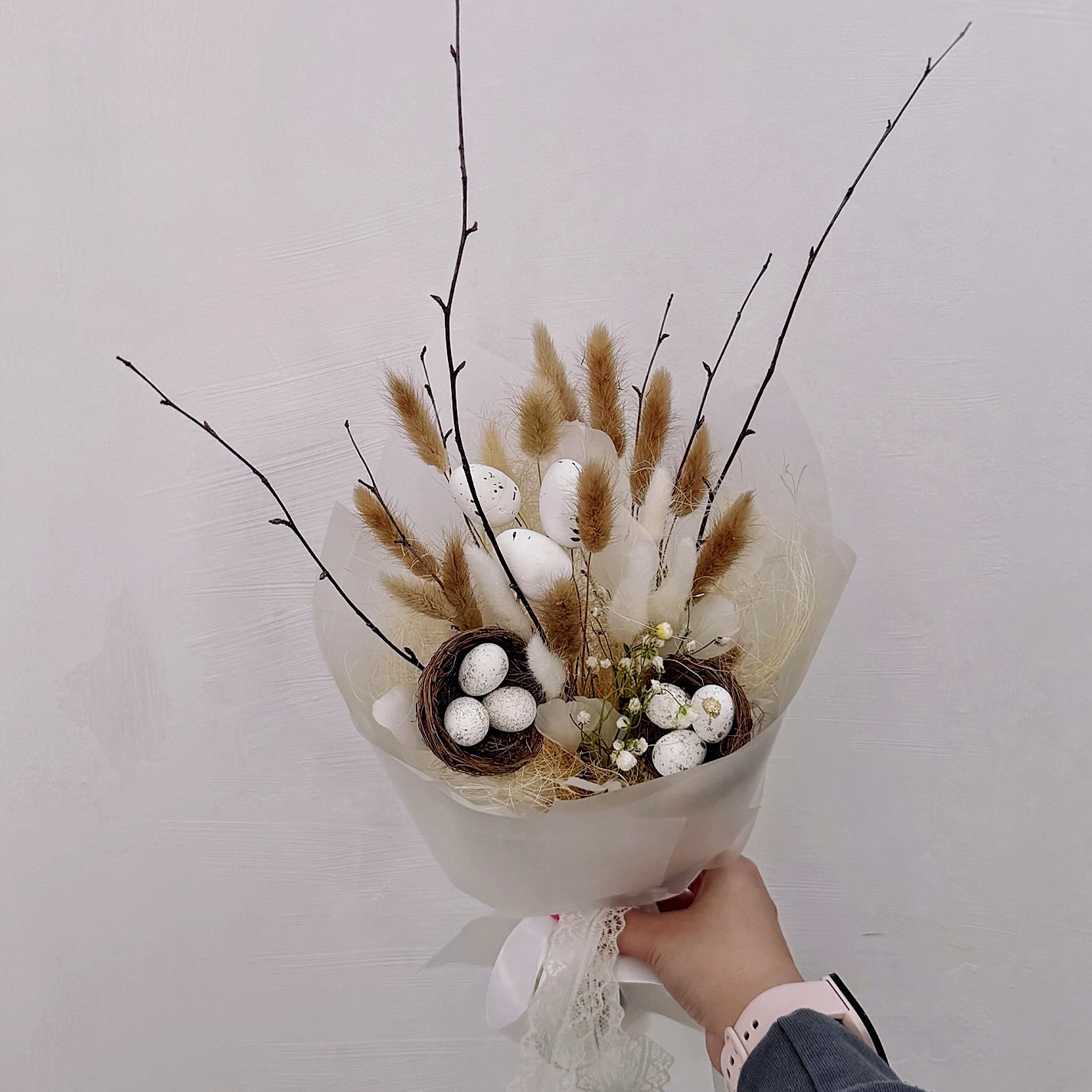 Каждая деталь здесь дышит весной: мягкие соцветия лагуруса напоминают о солнечных лучах, а яйца — символ новой жизни и обновления. Этот букет не требует сложного ухода — он долго сохраняет свежий вид и станет нежным акцентом на пасхальном столе или самостоятельным подарком для тех, кому вы хотите подарить частичку душевного тепла.