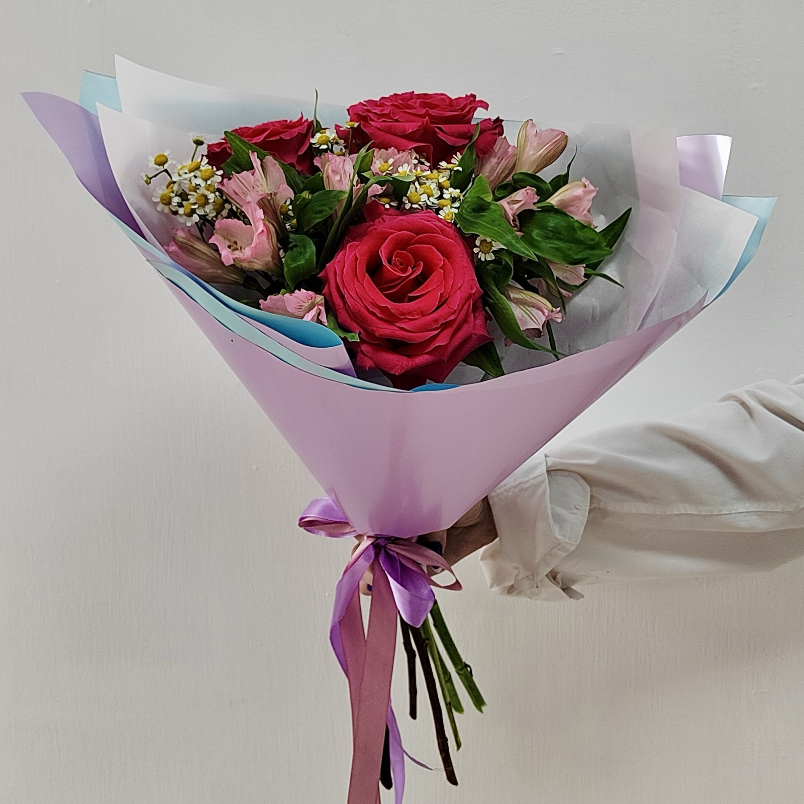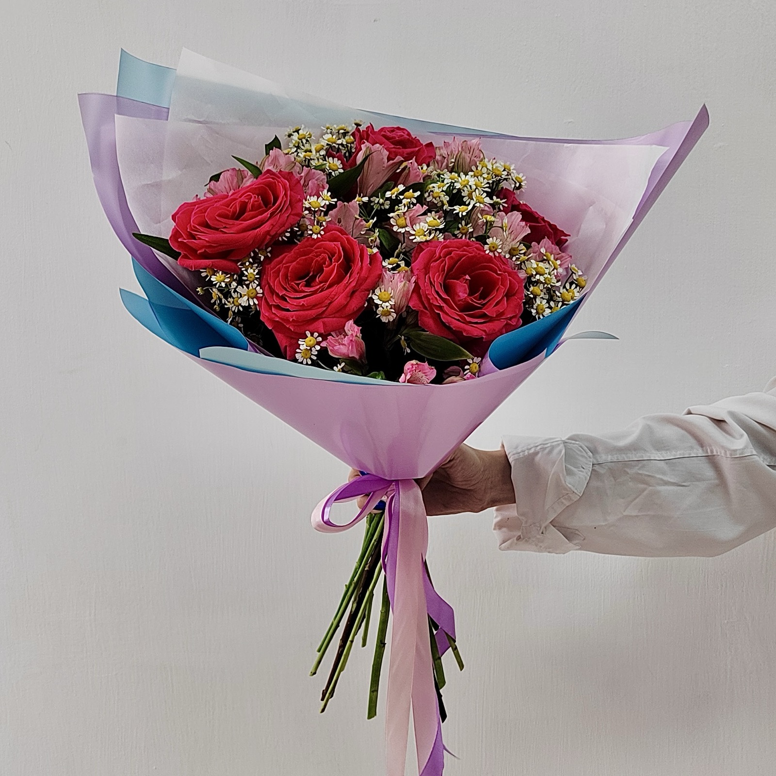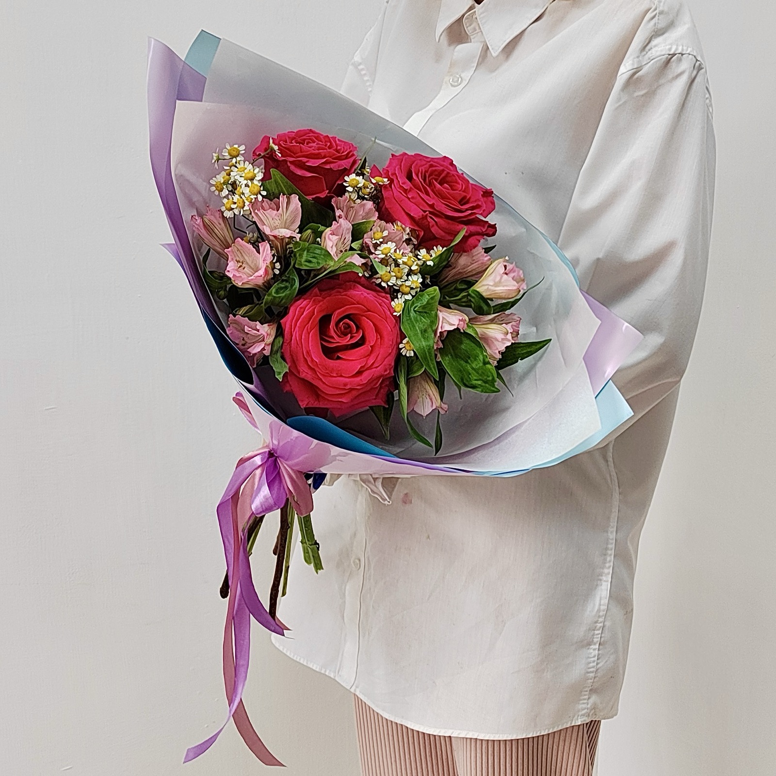 Яркий букет с малиновыми розами, ромашками и альстромерией | Размер на выбор