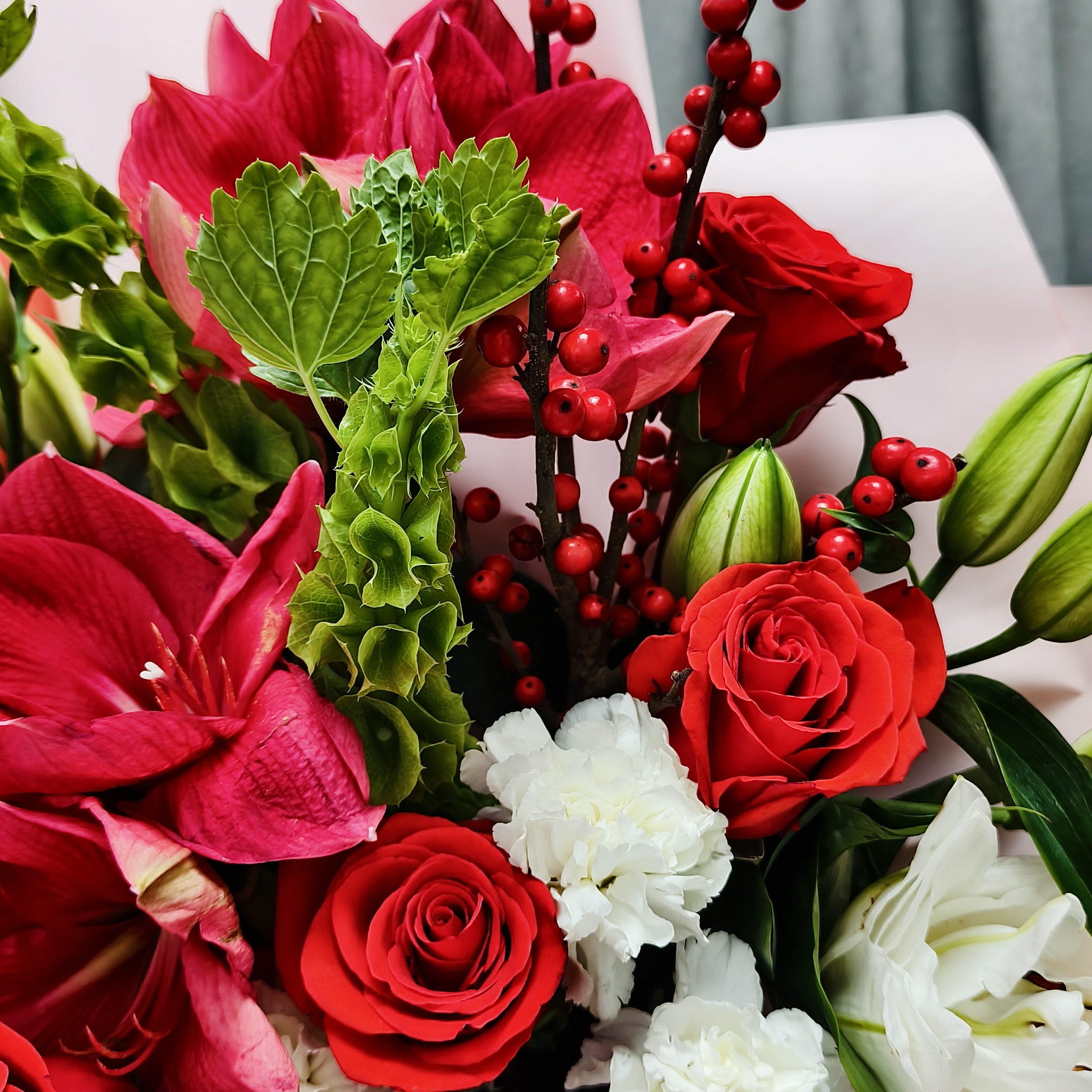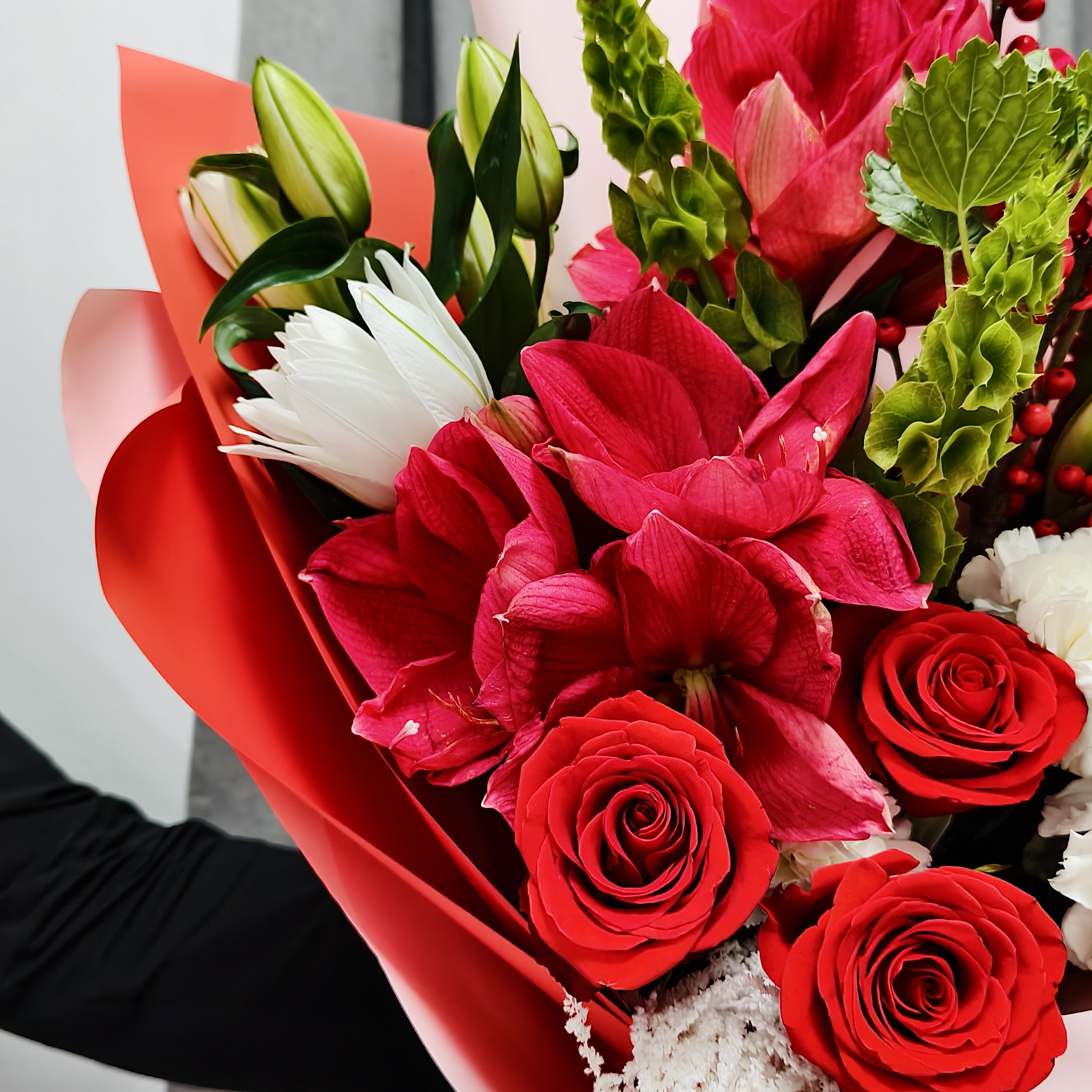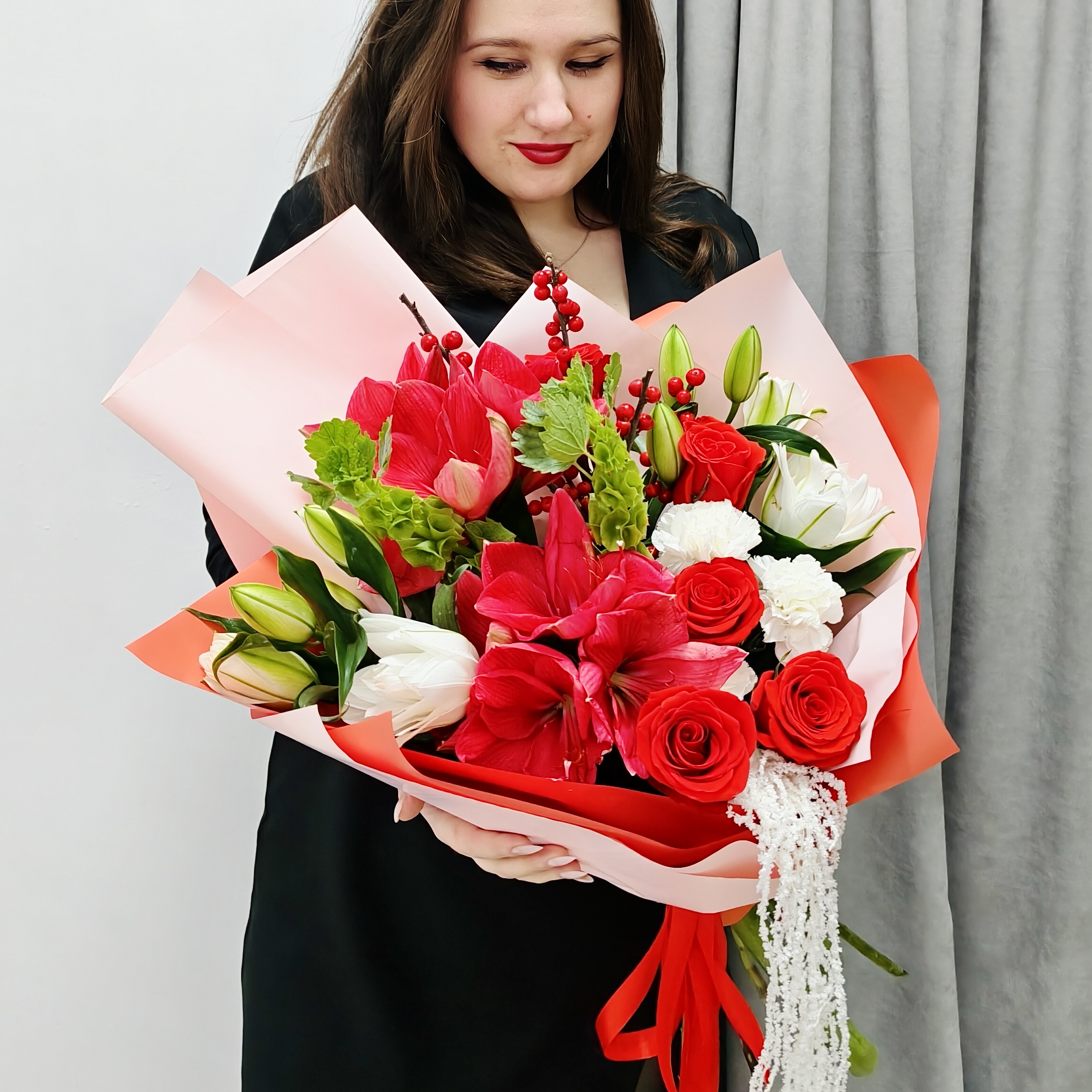 Яркий готовый букет с амариллисами и лилией | Красные амариллисы, кустовая роза, ароматная лилия