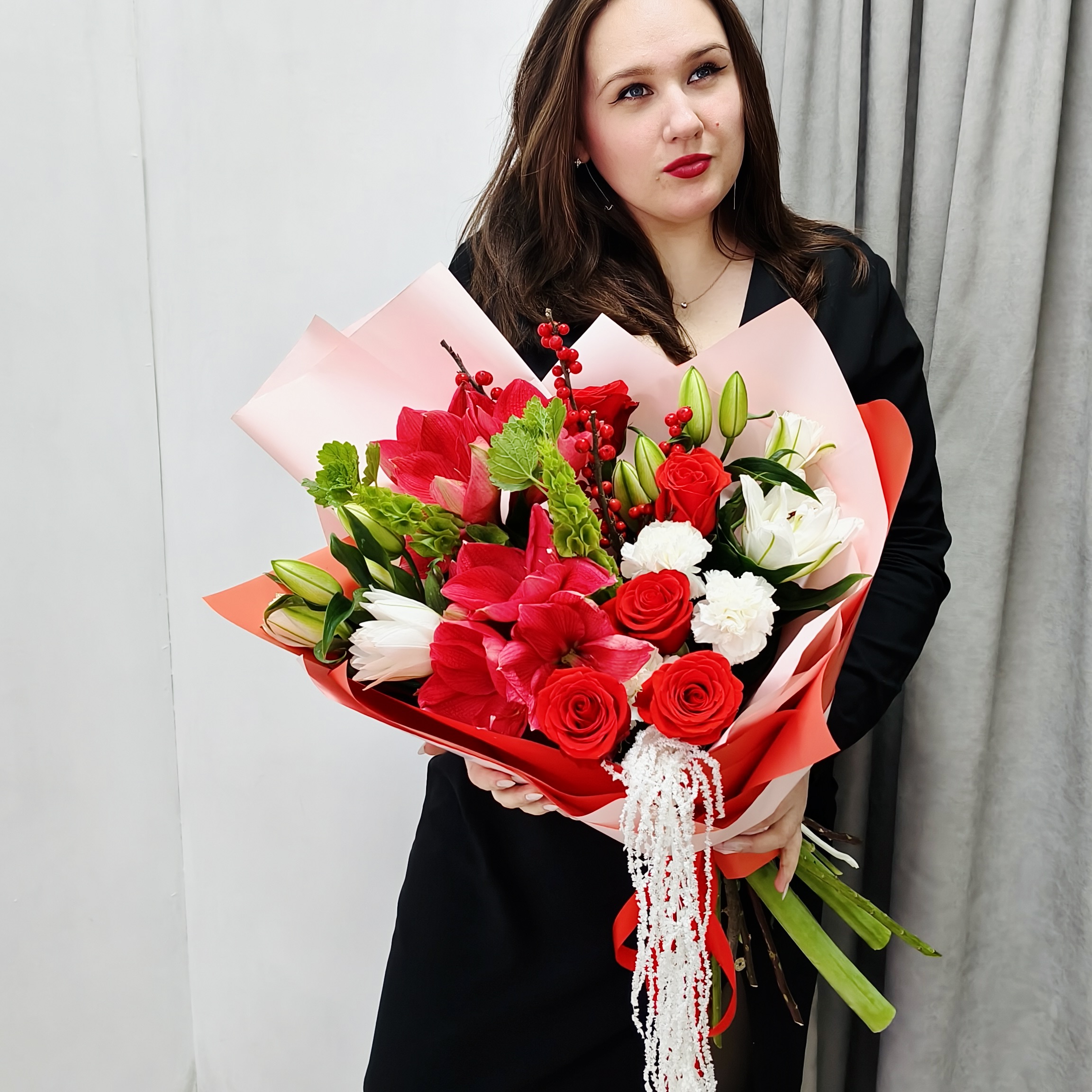 Букет собран для тех, кто ценит яркую индивидуальность: величественные амариллисы, благородная кустовая роза и пышная ароматная лилия звучат в унисон, создавая симфонию страсти, нежности и изысканного благоухания.