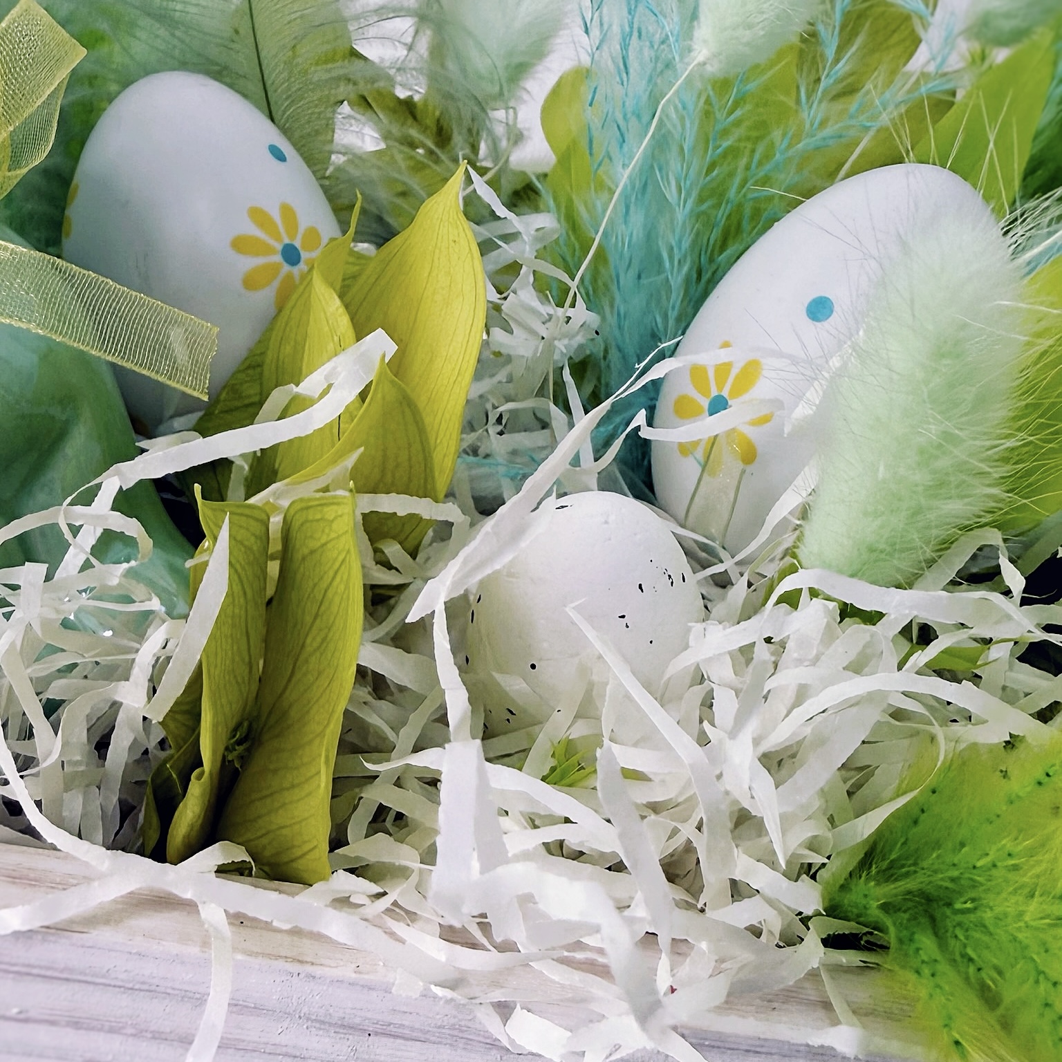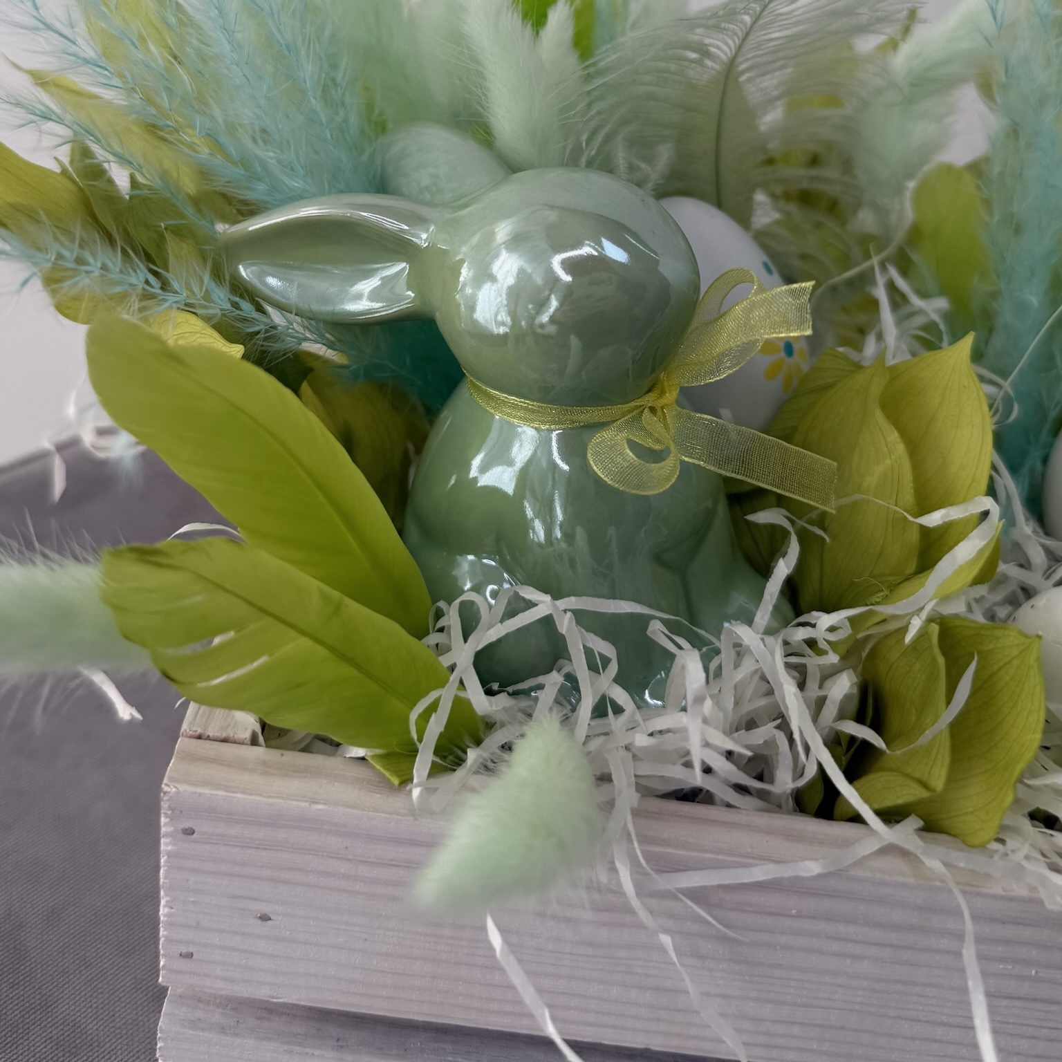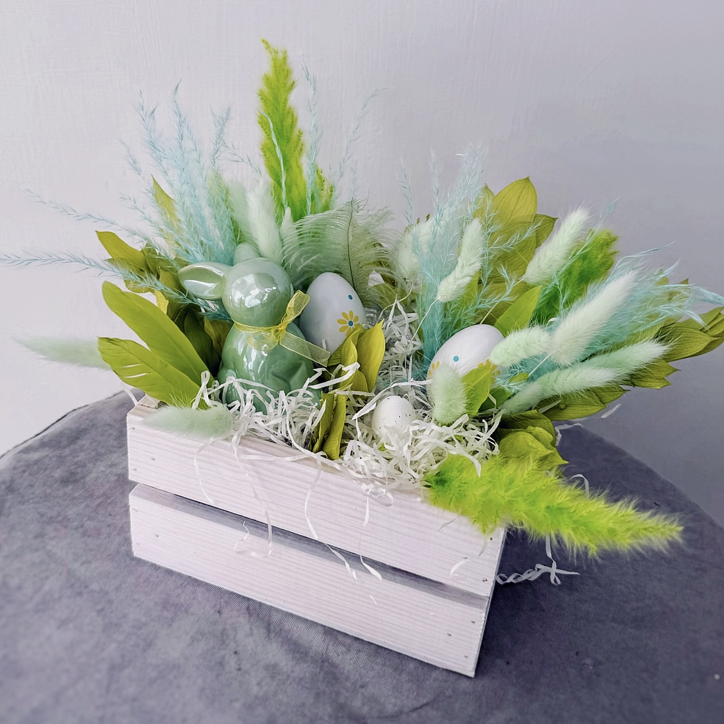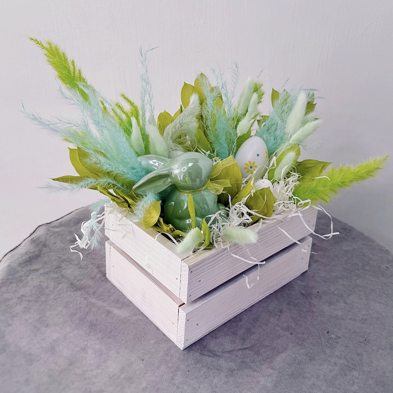 Светлая Пасха — время, когда хочется дарить особенное. Эта композиция в деревянном ящике (размер 30/25 см) выполнена в нежной светло-зелёной гамме — цвете весеннего пробуждения, надежды и новой жизни.