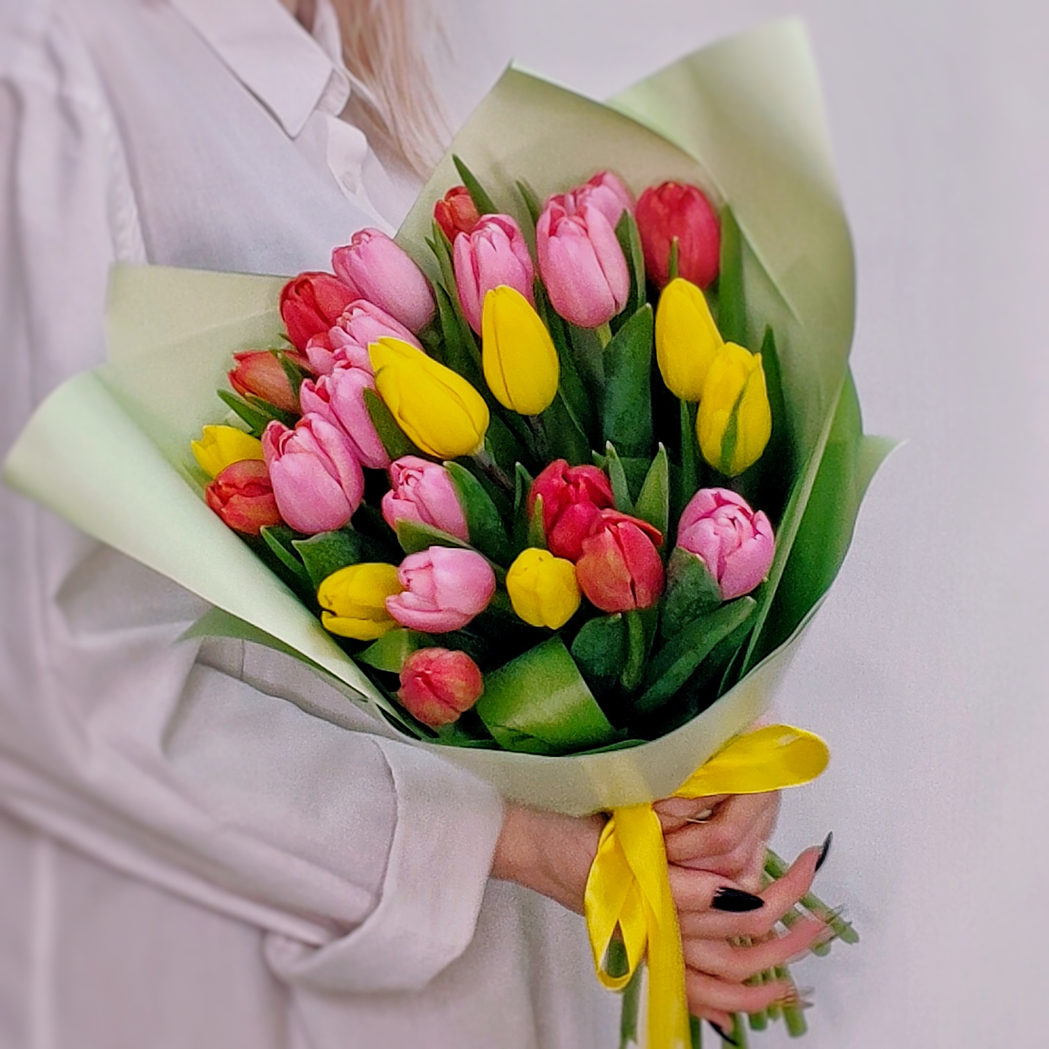 На фотографии букет из 25 ярких тюльпанов (оттенки могут отличаться)